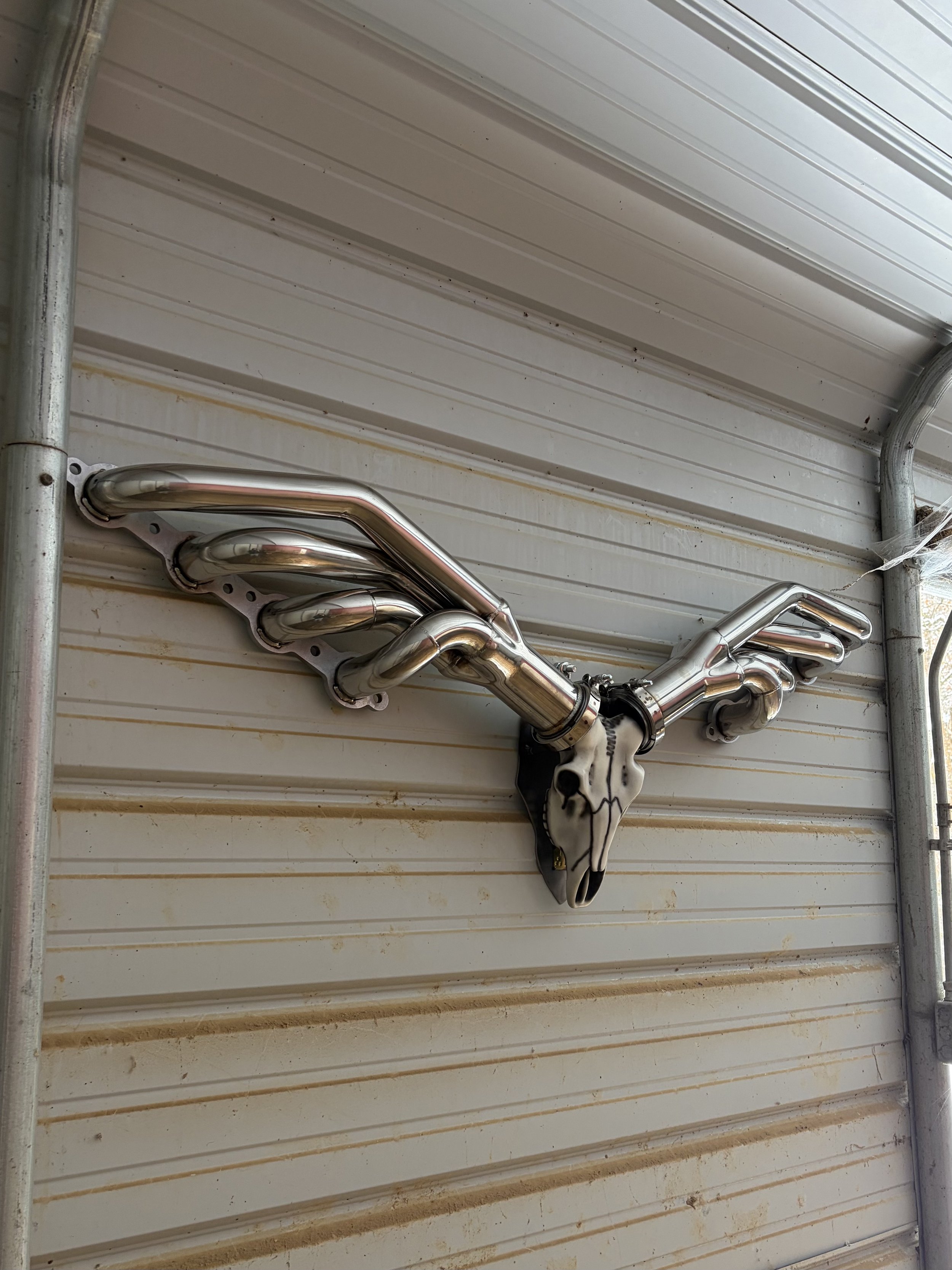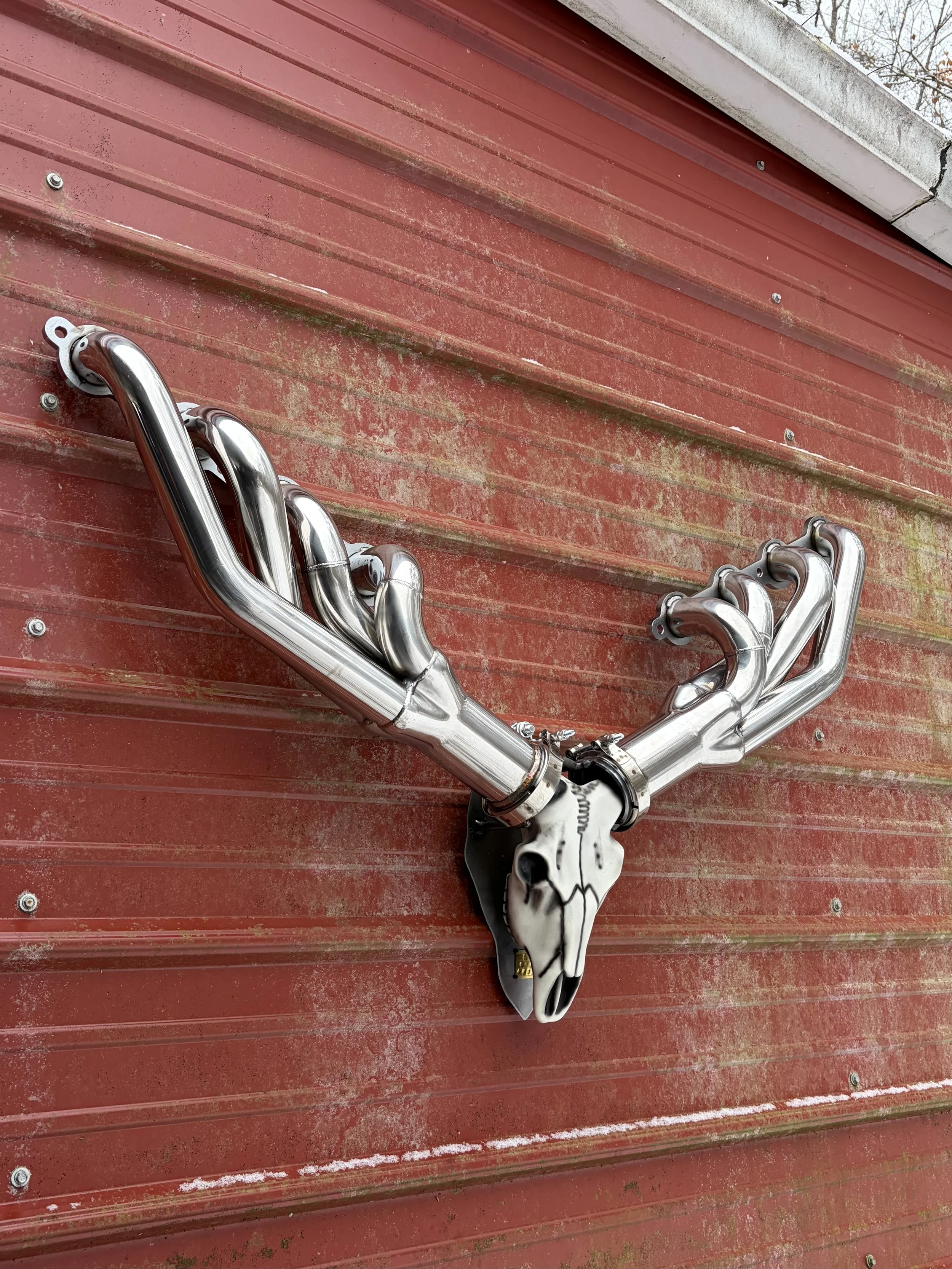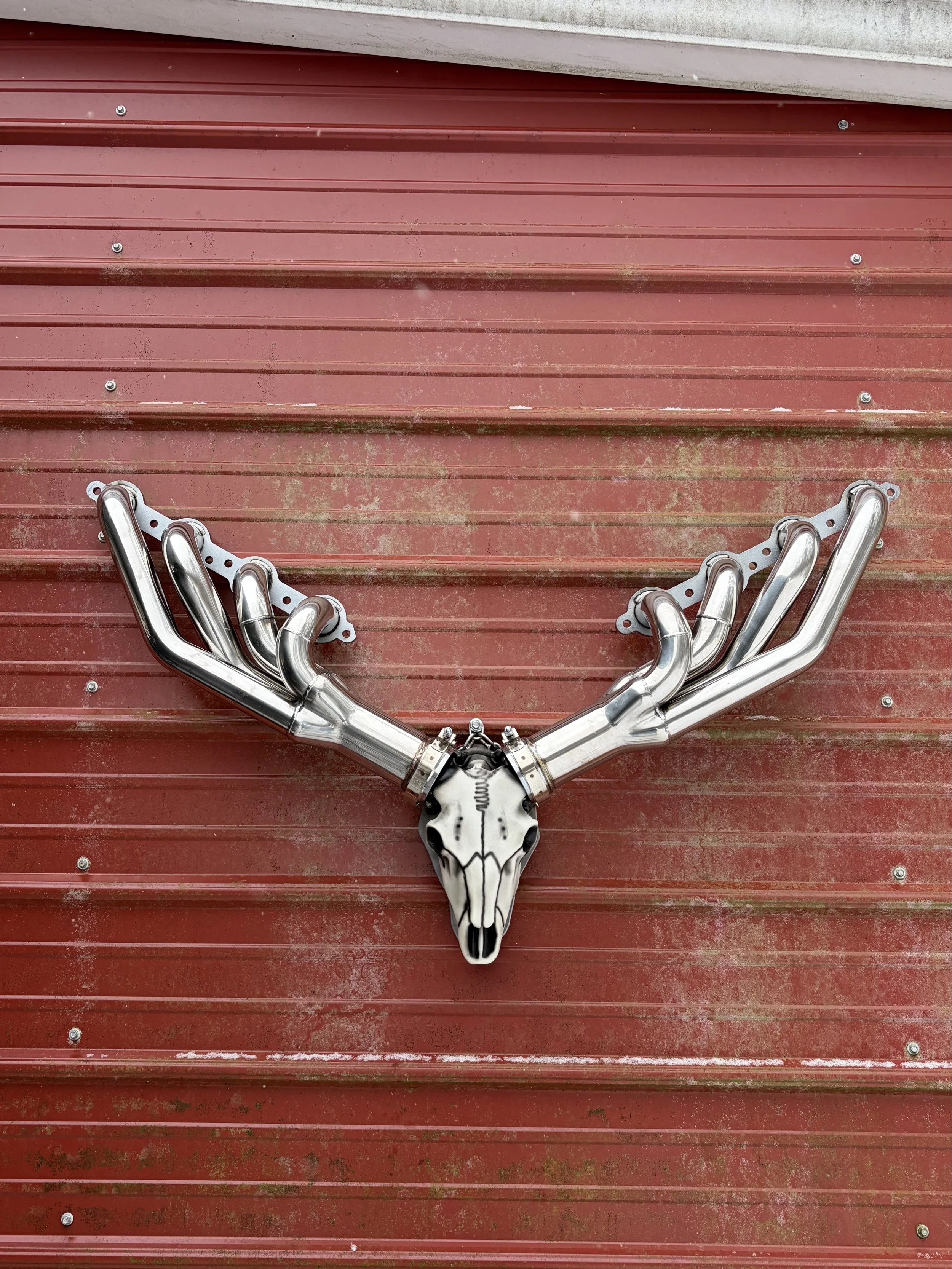 V8 Header with faux deer skull. Sourced from a MOPAR Big Block Hemi.