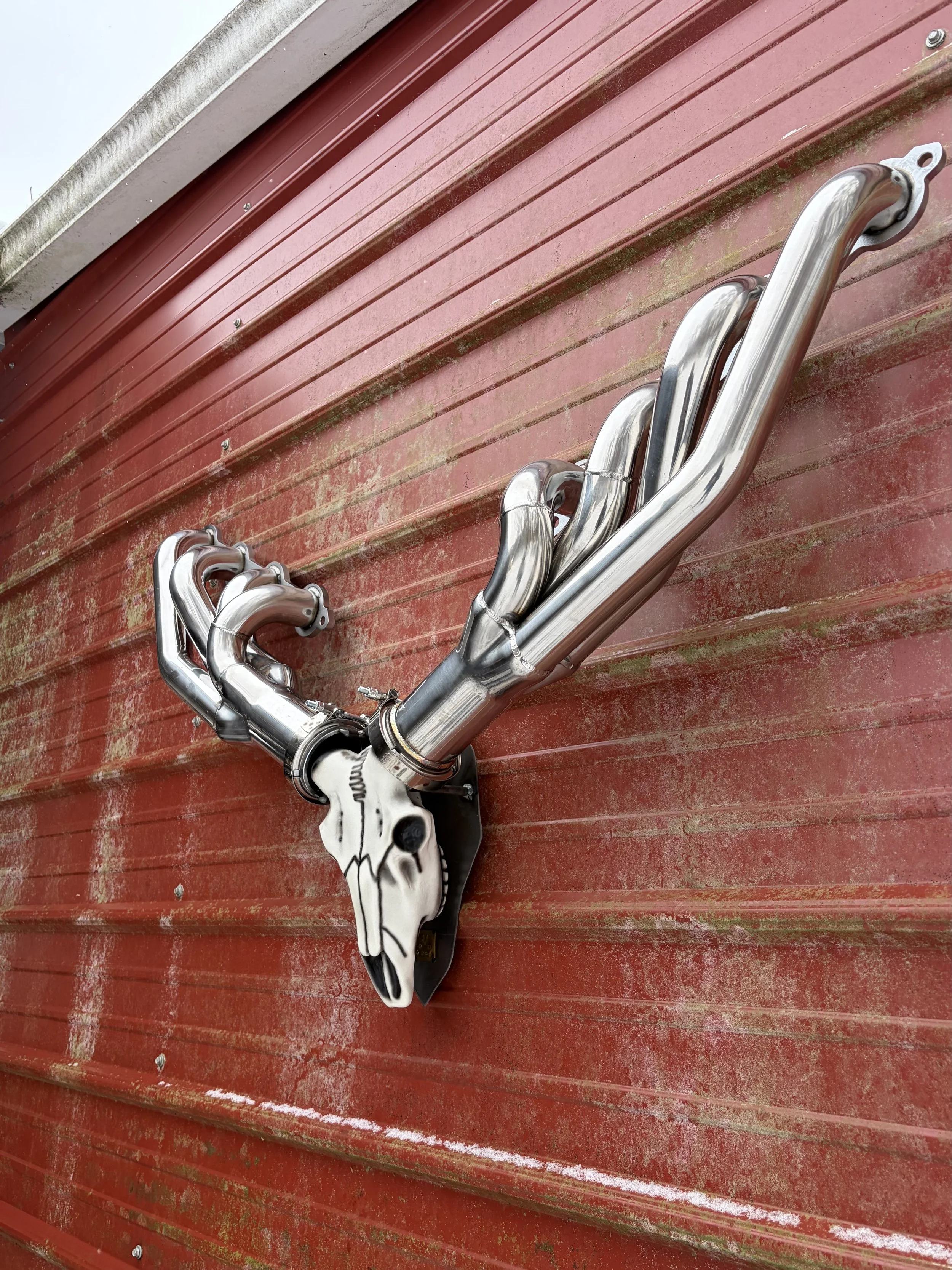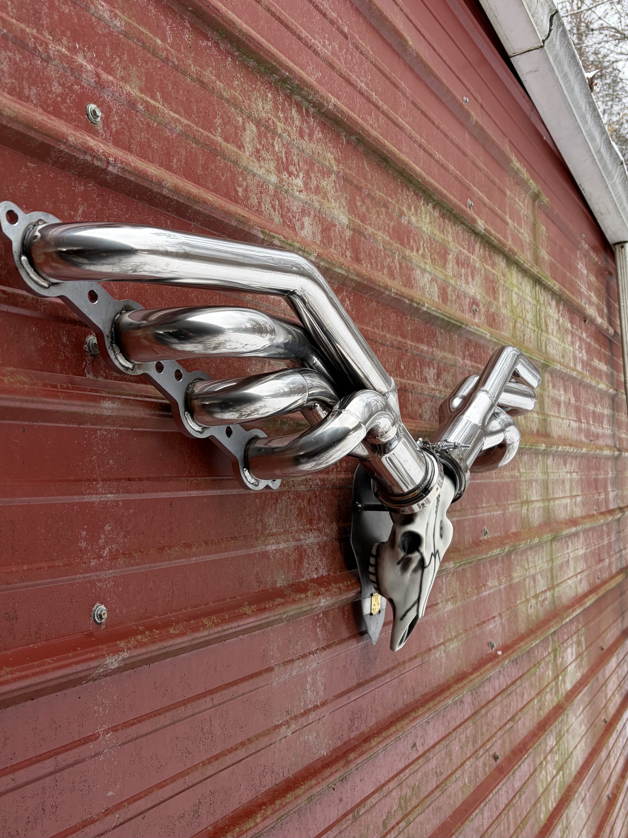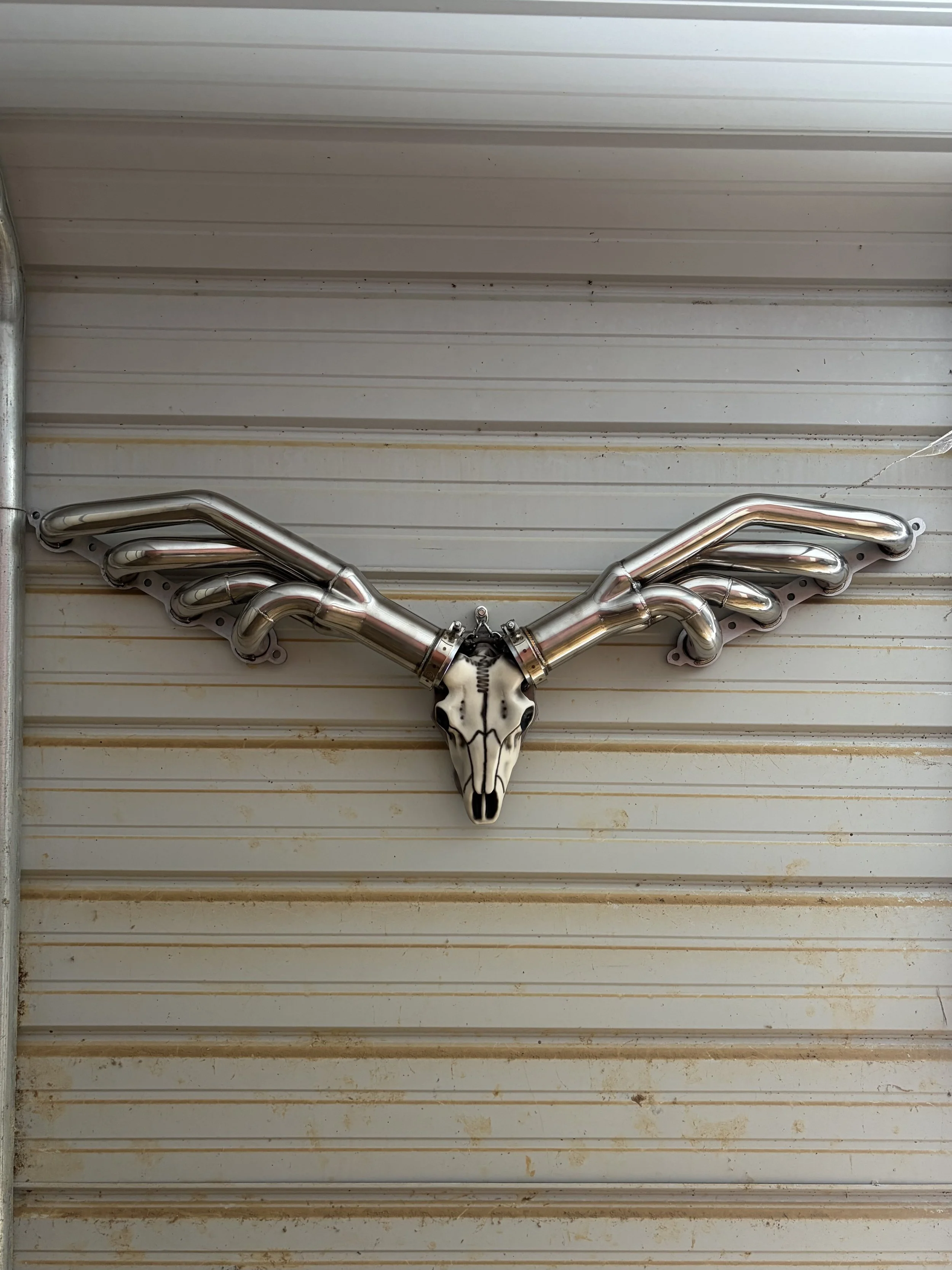 V8 Header with faux deer skull. Sourced from a MOPAR Big Block Hemi.